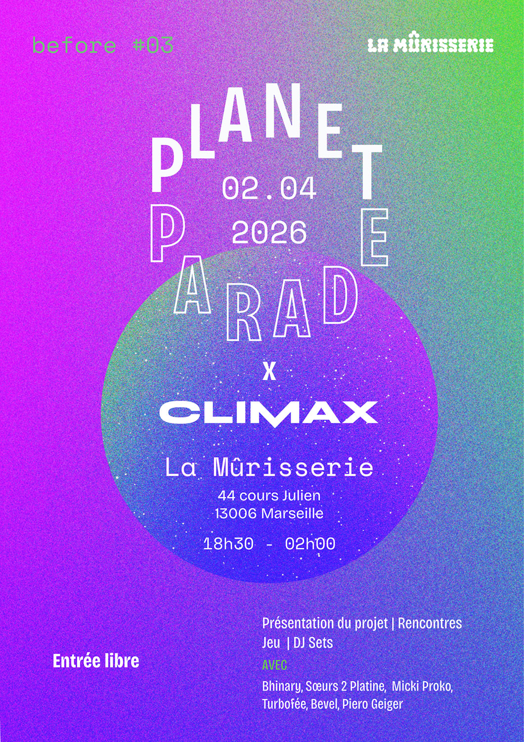 Bref, tout ce qu’il faut pour relier la communauté Planet Parade, celle de Climax et la nouvelle scène engagée marseillaise, avant la grande fête collective de 2027.